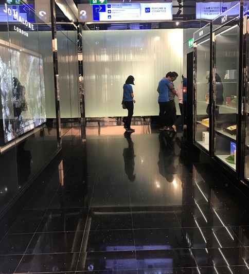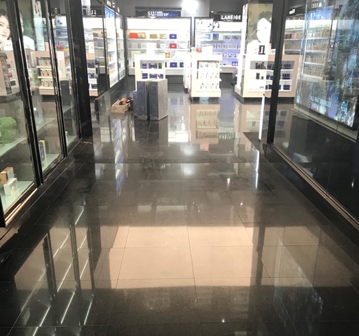 Entire 3rd floor walkway & Cosmetic Display flooring was done with use of MQW 217 Black Galaxy Quartz stone